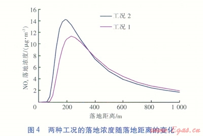 表2中木表示折算值,是將工況1排放量折算到與工況2相同供熱量條件下的數(shù)據(jù)。標(biāo)準(zhǔn)狀態(tài)是指101325Pa、0℃,工況1煙氣排放量對應(yīng)狀態(tài)為101360Pa、54.1℃,工況2煙氣排放量對應(yīng)狀態(tài)為101310Pa、22.3℃。NOx最大落地濃度和最大落地距離見表2。落地濃度隨落地距離(落地處與煙囪的距離)的變化見圖4。