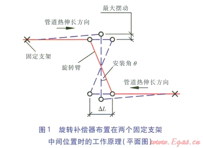 在理論上以及廠家說(shuō)明書(shū)上并沒(méi)有限制旋轉(zhuǎn)補(bǔ)償器轉(zhuǎn)角,但實(shí)際上,旋轉(zhuǎn)補(bǔ)償器的轉(zhuǎn)角(安裝角的2倍)不宜過(guò)大,應(yīng)限制在40°以內(nèi),否則會(huì)帶來(lái)兩個(gè)問(wèn)題:一是造成管道擺動(dòng)過(guò)大,二是易造成補(bǔ)償器轉(zhuǎn)角過(guò)大導(dǎo)致泄漏。旋轉(zhuǎn)補(bǔ)償器布置在兩個(gè)固定支架中間位置時(shí)的工作原理見(jiàn)圖l。為補(bǔ)償管道的熱伸長(zhǎng)量,又不使得旋轉(zhuǎn)補(bǔ)償器出現(xiàn)較大的轉(zhuǎn)角和擺動(dòng),需限定旋轉(zhuǎn)臂最小長(zhǎng)度及最佳安裝角。