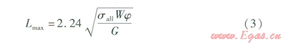 關(guān)于按強(qiáng)度條件確定活動(dòng)支架允許間距的計(jì)算,一些文獻(xiàn)給出了不同的計(jì)算方法。文獻(xiàn)[9]給出的計(jì)算式為: