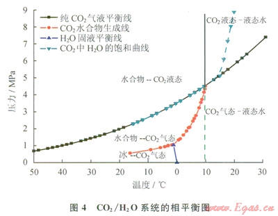 對管道安全運(yùn)行影響最大的雜質(zhì)就是水。從大多數(shù)源頭捕獲的CO2混合氣體都含有一定量的水。實(shí)際含水量隨氣體來源不同而變化。例如,利用氨吸收法從煙道氣中捕集的CO2中含水量的體積分?jǐn)?shù)通常超過5%。絕大部分的水在壓縮及脫水階段(常采用三甘醇)被脫除。而來自于煤氣化工藝的CO2通過低溫甲醇洗分離工藝,只含有0.0002%的水。