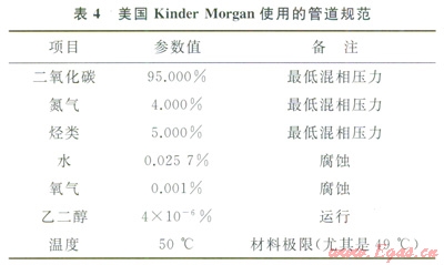 日前運(yùn)行的管道中所輸送的CO2混合物及對純度和含水量的規(guī)定等都不盡相同。國際上對于管道系統(tǒng)輸送CO2混合氣體的組成要求沒有統(tǒng)一的標(biāo)準(zhǔn)。混合氣體的組成要求很大程度上取決于設(shè)計(jì)階段進(jìn)行的評估,包括流動安全、管道完整性、安全性及終端用戶對CO2純度的需求。美國Kinder Morgan使用的管道規(guī)范見表4[12]。