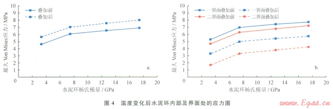 由圖4-a圖看出,水泥環(huán)內(nèi)的最大Von Miscs應(yīng)力隨水泥環(huán)楊氏模量的增大而增大;與初始應(yīng)力替加后,Von Mises應(yīng)力增大為4.4~8.0MPa,小于普通水泥環(huán)的屈服強度。所以,當溫度變化幅度不大時,水泥環(huán)通常不會發(fā)生屈服破壞,但溫度升高幅度較大時水泥環(huán)可能會發(fā)生屈服破壞。因此,對熱采井等應(yīng)避免使用膨脹水泥漿,且應(yīng)使用低楊氏模量的水泥環(huán)。由圖4-b可以看出,與初始應(yīng)力疊加前,一、二界面在徑向上受拉伸應(yīng)力的作用且應(yīng)力隨水泥環(huán)的楊氏模量增大而增大,為4.4~8.0MPa,遠大于一、二界面膠結(jié)的抗拉強度,會破壞一、二界面膠結(jié);與初始應(yīng)力疊加后,徑向應(yīng)力顯著降低至1.4~6.0MPa,降低了一、二界面膠結(jié)破壞的風險。因此,通過降低水泥環(huán)楊氏模量和增大初始應(yīng)力都可以降低界面膠結(jié)破壞的風險,建議采用較低楊氏模量的水泥環(huán)或使用膨脹水泥來預(yù)防失效。