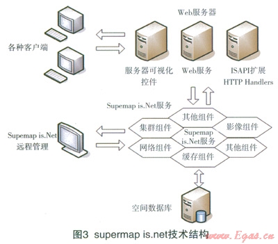 G1S的數(shù)據(jù)庫是以圖形為基礎(chǔ),根據(jù)不同的要求有不同的數(shù)據(jù)結(jié)構(gòu)[10]。本文采用supermap組建來實(shí)現(xiàn)燃?xì)夤艿里L(fēng)險(xiǎn)水平的可視化。supermap是一個(gè)標(biāo)準(zhǔn)的控件GIS產(chǎn)品,可以在多種語言上使用。Supermap中deskpro是一套運(yùn)行在桌面端的專業(yè)GIS軟件,提供了地圖編輯、屬性數(shù)據(jù)管理、分析與決策輔助事務(wù)處理、地圖輸出、報(bào)表打印、三維建模等方面的功能。supermap is.net是新一代網(wǎng)絡(luò)地理信息系統(tǒng)開發(fā)平臺(tái),supemlap is.net由客戶端用戶界面表現(xiàn)組件、web服務(wù)器擴(kuò)展、GIS服務(wù)器、數(shù)據(jù)服務(wù)器以及遠(yuǎn)程管理器等多個(gè)組件組成,如圖3所示[11-13]。