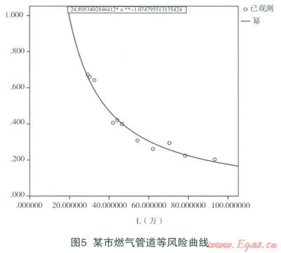 (2)對(duì)上述數(shù)據(jù)用回歸分析法進(jìn)行擬合,可得該城市的等風(fēng)險(xiǎn)曲線,如表1和圖5所示,運(yùn)算結(jié)果為R=P*L=24.765,即該城市燃?xì)夤艿里L(fēng)險(xiǎn)值為24.765。