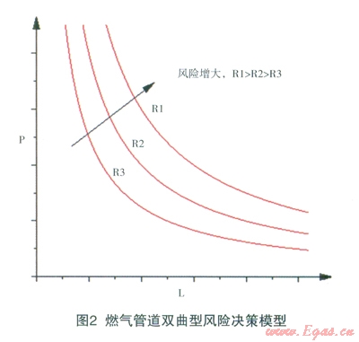 由風(fēng)險(xiǎn)計(jì)算公式R=pxl可知燃?xì)夤艿朗鹿拾l(fā)生的概率和可能造成的經(jīng)濟(jì)損失呈倒冪數(shù)關(guān)系,因此回歸方程即為R=pxl。用回歸分析法進(jìn)行相關(guān)分析,然后計(jì)算預(yù)測(cè)誤差,最后確定燃?xì)夤艿赖娘L(fēng)險(xiǎn)值,即可得到該城市的風(fēng)險(xiǎn)曲線,每段燃?xì)夤艿赖娘L(fēng)險(xiǎn)值與此比較,判斷其風(fēng)險(xiǎn)可接受性,即可建立雙曲型風(fēng)險(xiǎn)決策模型如下圖2所示,其中P表示燃?xì)夤艿朗鹿拾l(fā)生的概率,L表示燃?xì)夤艿朗鹿拾l(fā)生造成的損失。