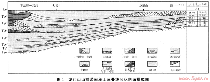 龍門山崛起之后,在山前發(fā)育前陸盆地型沉積,劃為構造層序三。前陸盆地的剖面形態(tài)為西陡東緩的箕形盆地。因而沖積、濁積型的扇三角洲或辮狀河三角洲及湖成三角洲砂體分布區(qū)是區(qū)內(nèi)的主要有利相帶和砂體類型。