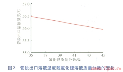 氯化鋰溶液的常用質(zhì)量分數(shù)范圍為35%~45%,以管段1-0為例,當其他條件不變時,管段出口溶液溫度隨氯化鋰溶液質(zhì)量分數(shù)的變化見圖3。由圖3可知,在計算工況下,氯化鋰溶液質(zhì)量分數(shù)越高,溶液溫降越大。