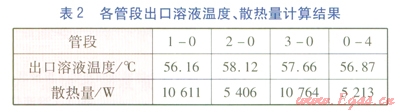 由單管溫降模型、單管散熱模型計算得到的各管段出口溶液溫度、散熱量見表2。由管網(wǎng)仿真模型計算得到節(jié)點0處溶液溫度為57.38℃,溶液質(zhì)量分數(shù)為40.18%。