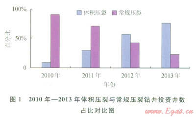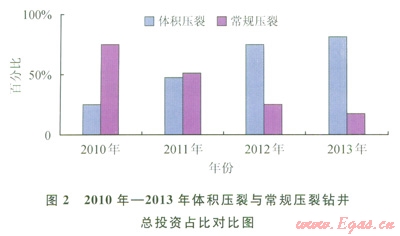 2010年—2013年蜀南氣礦在川南地區(qū)加砂壓裂鉆井累計(jì)投資267623萬元:其中體積壓裂179231萬元、占比66.97%,常規(guī)壓裂88392萬元、占比33.03%。在此期間,2010年加砂壓裂投資21311萬元:其中體積壓裂5386萬元,占比25.25%,常規(guī)壓裂15925萬元,占比74.75%;2011年加砂壓裂投資59344萬元:其中體積壓裂28608萬元,占比48.21%,常規(guī)壓裂30736萬元,占比51.79%;2012年投資107910萬元:其中體積壓裂80645萬元,占比74.73%,常規(guī)壓裂27265萬元,占比25.27%;2013年投資79058萬元:其中體積壓裂64592,占比81.7%,常規(guī)壓裂14466萬元,占比18.3%,體積壓裂投資占比呈逐漸上升趨勢(shì)(圖2)。