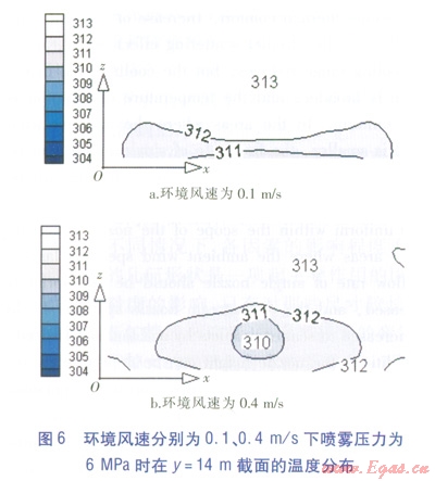 環(huán)境風速分別為0.1、0.4m/s下,噴霧壓力為6MPa時在z=1.5m截面及y=14m截面的溫度分布見圖5、6。環(huán)境風速為0.1m/s時,z=1.5m截面上降溫區(qū)域集中,其他區(qū)域降溫幅度僅0.5~1.0K,y=1.4m截面上空氣溫度幾乎沒有被影響。環(huán)境風速為0.4m/s時,降溫1~2K的范圍變大,降溫區(qū)域分布更均勻,在y=14m截面上出現(xiàn)1~3K的溫降,并且處在人員可感知的高度上。