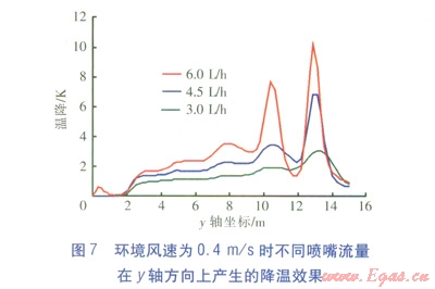 在環(huán)境風速為0.4m/s,噴霧壓力為6MPa的條件下,增加單個噴嘴的流量進行模擬,對比3種噴嘴流量(3.0、4.5、6.0L/h)下,x=4m截面上。z=1.5m處在y軸方向上產(chǎn)生的降溫效果,見圖7。