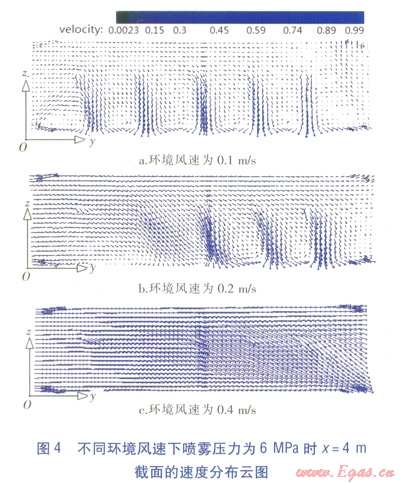 不同環(huán)境風速下,噴霧壓力為6MPa時x=4m截面的溫度、速度分布云圖分別見圖3、4。由圖3、4可知,在來流空氣與噴霧引起的氣流的綜合作用下,環(huán)境風速不同時模型空間呈現(xiàn)出不同的溫度、速度分布。