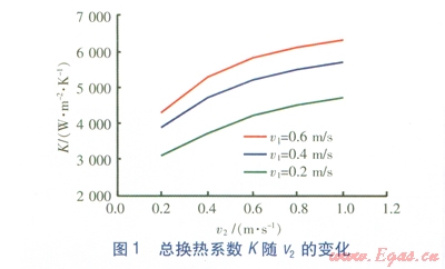 V1分別為0.2、0.4、0.6m/s時(shí),由式(1)計(jì)算得到的總換熱系數(shù)K隨穢:的變化見圖1。由圖1可知,當(dāng)v1一定時(shí),總換熱系數(shù)K隨v2的增大而增大,但增大的幅度在減小。