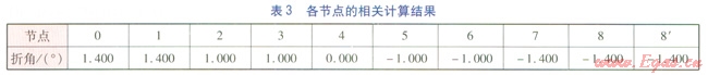 某直埋供熱管道規(guī)格為DN 1000mm,在敷設(shè)過(guò)程中遇到障礙物,要求在40m左右的距離內(nèi)偏移1m,之后管道需再調(diào)整回原管位。最大允許折角取1.4°,管段最短長(zhǎng)度限定為1m。管道布置方式見(jiàn)圖4。由于管道基本以障礙物(管段8—8¢所在位置)為中心成對(duì)稱布置,因此圖4僅給出一側(cè)的管道。各節(jié)點(diǎn)、各管段的相關(guān)計(jì)算結(jié)果分別見(jiàn)表3、4。為方便表述,定義管段向右側(cè)偏轉(zhuǎn)時(shí),折角為正值;向左側(cè)偏轉(zhuǎn)時(shí),折角為負(fù)值。