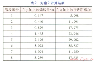 由表1、2可知,若實(shí)現(xiàn)0.879m的y軸上的偏移量,方案2在x軸上僅行進(jìn)17.975m,而方案1需行進(jìn)23.982m。這說(shuō)明,采取縮短管段長(zhǎng)度的方法,有利于在較短的行進(jìn)距離內(nèi)實(shí)現(xiàn)較大的偏移量,從而順利避開(kāi)障礙物。需要指出的是:在實(shí)際工程中,我們可以采取多實(shí)際折角與多管段長(zhǎng)度相結(jié)合的處理方法,但焊縫數(shù)量不宜過(guò)多,以影響施工質(zhì)量。不應(yīng)出現(xiàn)避讓開(kāi)障礙物后,管道調(diào)整回原管位時(shí)出現(xiàn)實(shí)際折角大于最大允許折角的情況。