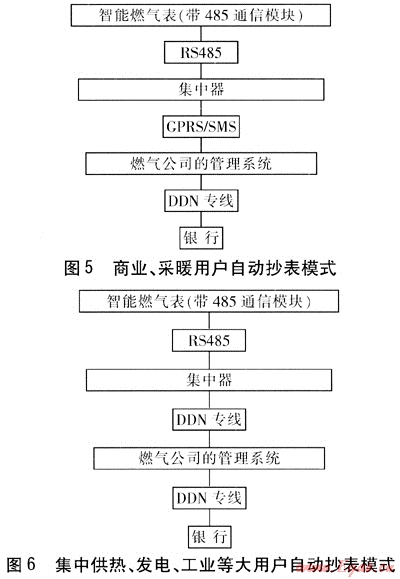 特點(diǎn):商業(yè)用戶(hù)主要包括酒店、餐廳等,常年用氣,用戶(hù)分散,流量通常在500m3/h以下。采暖、制冷用戶(hù)主要是季節(jié)性用氣大戶(hù),而且在采暖、制冷期實(shí)行不同的燃?xì)鈨r(jià)格機(jī)制,流量通常為500~5000m3/h。此類(lèi)用戶(hù)的數(shù)量比居民用戶(hù)少得多,但用氣量卻遠(yuǎn)大于居民用戶(hù)。建議采用圖5所示的自動(dòng)抄表模式。