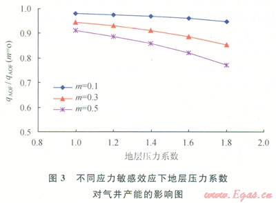 在油氣藏開發(fā)過中,儲層有效應力可表述為上覆地層壓力與孔隙壓力之差,在一定的上覆地層壓力情況下,儲層有效應力只與地層壓力有關,儲層有效應力將會隨著地層壓力系數(shù)變化而變化。如圖3所示,在同樣的生產(chǎn)條件下,地層壓力系數(shù)越大的氣藏(即越具有高異常壓力顯著特征的氣藏),開發(fā)過程中應力敏感效應將越嚴重,單井產(chǎn)能損失越大。