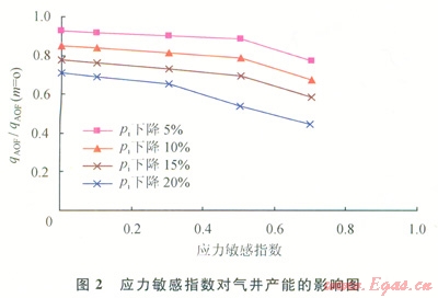 應力敏感指數(shù)對氣井無阻流量的影響如圖2所示,可見氣井無阻流量隨應力敏感指數(shù)的增大損失將越大。即說明實際應力敏感氣藏開發(fā)生產(chǎn)過程中,越具有強應力敏感效應的氣藏,應力敏感效應越嚴重,氣井產(chǎn)能相對損失就越大。