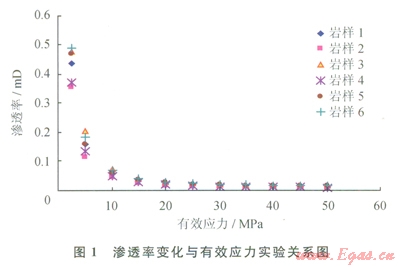 油氣藏儲層應力敏感性是指儲層物性隨有效應力的變化而發(fā)生變化的現(xiàn)象,有效應力通常定義為上覆地層壓力與地層孔隙壓力之差。因此在實驗中常采用壓敏實驗(定圍壓變內壓)和覆壓實驗(定內壓變圍壓)來模擬實際油氣藏儲層應力敏感性。郭平等[14-18]通過對兩種實驗對比分析,得出兩種實驗所獲得的巖心滲透率的變化規(guī)律是一致的。筆者依此選用鶯歌海某氣田Dl井黃流組的巖心開展覆壓實驗研究。