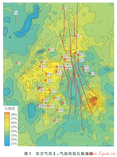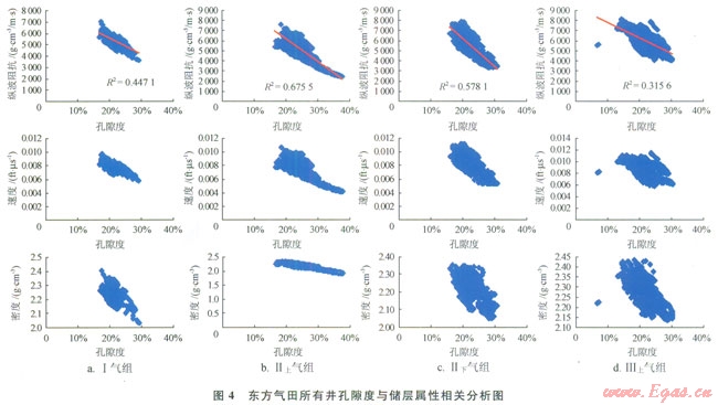 在進(jìn)行儲(chǔ)層孔隙度橫向描述之前,需要進(jìn)行了大量的儲(chǔ)層物性研究工作。研究的目的是通過分析儲(chǔ)層物性和與地震資料有直接關(guān)系的儲(chǔ)層的速度、密度和波阻抗等地震屬性的相關(guān)關(guān)系,來建立起合理的井震關(guān)系[14]。中海石油(中國(guó))有限公司湛江分公司西部東方氣田各氣組單井孔隙度與地震的波阻抗、速度和密度都有一定的相關(guān)性。圖4為東方氣田多井分氣組進(jìn)行的孔隙度與地震的波阻抗、速度和密度的相關(guān)分析結(jié)果,從圖4上可以看出各氣組儲(chǔ)層的孔隙度與這幾種地震屬性有較好的相關(guān)關(guān)系,其中Ⅱ上氣組孔隙度和波阻抗的相關(guān)關(guān)系高達(dá)0.82,這說明東方氣田儲(chǔ)層的孔隙度與地震屬性有較好的相關(guān)性。因此,可以利用與地震屬性的相關(guān)性預(yù)測(cè)儲(chǔ)層孔隙度的方法來描述孔隙度的橫向變化。通過抽井檢驗(yàn)和儲(chǔ)量對(duì)比等方式檢查認(rèn)為各個(gè)氣組的孔隙度預(yù)測(cè)結(jié)果均為合理結(jié)果(圖5)。