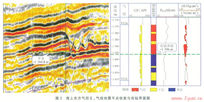研究表明,在一定的地質(zhì)條件下砂體含氣后在地震資料上表現(xiàn)為明顯的“亮點(diǎn)”效應(yīng),氣層的振幅異常能較好地反映砂體的含氣情況川。在鶯歌海盆地的多個(gè)淺層氣藏實(shí)際鉆井資料證實(shí),鉆在振幅“亮點(diǎn)”范圍內(nèi)的井,其目的層均含氣。低部位如受氣水界面控制,同一種地震屬性在氣水邊界之上和之下表現(xiàn)出來的響應(yīng)有很大差異,形成“平點(diǎn)”現(xiàn)象,根據(jù)該平點(diǎn)信息可確定氣水界面。測(cè)井解釋結(jié)果也證實(shí)該界面是可靠的。如圖2所示,東方氣田的Ⅱ上氣組,根據(jù)平點(diǎn)信息確定的氣水界面為海拔-1394.6m,根據(jù)該界面圈定的含氣范圍內(nèi)有明顯的“亮點(diǎn)效應(yīng)”,實(shí)際井鉆遇的氣水界面為海拔-1396.0m,證實(shí)在該區(qū)域可以依據(jù)三維地震資料的亮點(diǎn)效應(yīng)和平點(diǎn)現(xiàn)象來確定氣水界面,從而確定氣田的含氣面積。該方法可以應(yīng)用在沒有實(shí)鉆界面的其他氣組或鄰近相似氣田,來彌補(bǔ)海上氣田鉆井工作量相對(duì)少引起資料不足的缺陷。