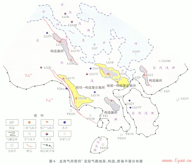 3)在大型地層尖滅的背景上,受構(gòu)造、斷層和巖性變化影響,發(fā)育地層 構(gòu)造、巖性一構(gòu)造等多種圈閉類型。雷四3亞段a小段尖滅帶附近的次級(jí)巖溶斜坡是尋找工業(yè)氣井的最有利區(qū)。