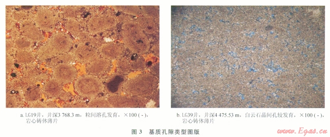 儲(chǔ)層基質(zhì)孔隙類型有粒間溶孔、晶間溶孔、粒內(nèi)溶孔、鑄??缀腕w腔孔,其中粒間溶孔、晶間溶孔是主要的孔隙類型,其發(fā)育程度直接影響到儲(chǔ)層的儲(chǔ)集能力。