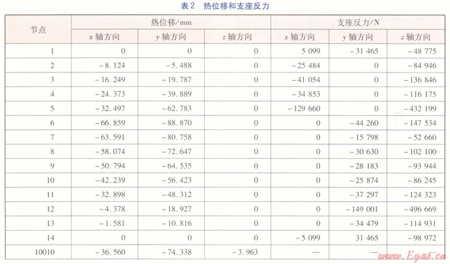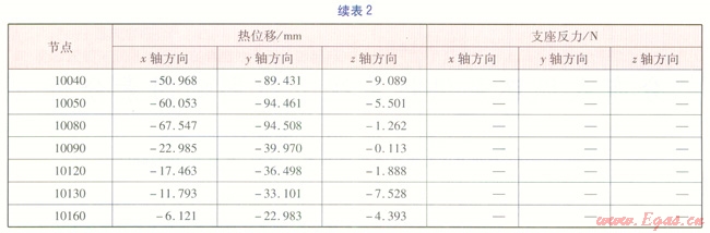 輸入數(shù)據(jù):熱水溫度130℃,設(shè)計壓力1.6MPa,管材Q2358,管道外直徑1220mm,直管壁厚16mm,彎頭壁厚18mm。其他參數(shù)可通過AutoPSA應(yīng)力分析軟件,實現(xiàn)手動調(diào)用或自動調(diào)用。建立好的計算模型經(jīng)AutoPSA應(yīng)力分析軟件分析計算,得到一次應(yīng)力、二次應(yīng)力、熱位移、支座反力。應(yīng)力驗算結(jié)果見表1,熱位移、支座反力見表2。由表1可知,供熱管道各單元的一次應(yīng)力、二次應(yīng)力均滿足《規(guī)范》要求。表2數(shù)據(jù)可作為結(jié)構(gòu)專業(yè)設(shè)計桁架的基礎(chǔ)數(shù)據(jù),表中負(fù)號表示方向與坐標(biāo)軸正向相反。