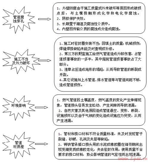 燃?xì)夤艿劳度脒\(yùn)行后,因腐蝕、管道接口、密封材料老化、安裝質(zhì)量不良、機(jī)械振動(dòng)、管道的熱脹冷縮等原因,產(chǎn)生穿孔、裂縫或斷裂造成燃?xì)庑孤?。燃?xì)庑孤┮院?,?huì)沿著一定的通道傳播到地面或建構(gòu)筑物內(nèi),當(dāng)泄漏的燃?xì)膺_(dá)到爆炸極限,遇火源則產(chǎn)生火災(zāi)、爆炸和一系列次生災(zāi)害,導(dǎo)致嚴(yán)重的人員傷亡和財(cái)產(chǎn)損失。