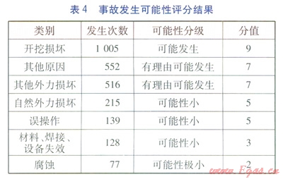 根據(jù)表1、圖1、2中的統(tǒng)計數(shù)據(jù),按照表2、3中制定的準則進行評分,通過式(1)計算城市燃氣管道風(fēng)險因素等級。事故發(fā)生可能性評分結(jié)果見表4,事故后果評分結(jié)果見表5。