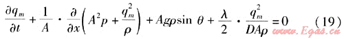 燃?xì)庠诠艿乐械牧鲃?dòng)是不穩(wěn)定流動(dòng),并且可看成一元流動(dòng),流體的壓力、密度、速度等參數(shù)是時(shí)間和管道長(zhǎng)度的函數(shù)。以管道軸線方向?yàn)楦曜鴺?biāo),垂直于管道軸線為z坐標(biāo),可根據(jù)流體力學(xué)知識(shí)建立燃?xì)庠诠艿纼?nèi)流動(dòng)的3個(gè)方程,具體如下[1]:
