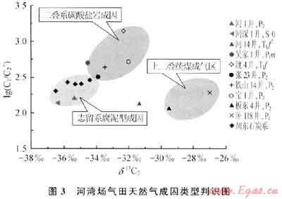 沈平(2005)根據(jù)天然氣乙烷碳同位素特征,將四川盆地海相地層天然氣劃分為3種類型。第一類是δ13C1<-34.0‰,最輕為-37.0‰左右(如福成寨石炭系),川東絕大部分石炭系,尤其是川東北地區(qū)基本屬于這一類。王廷棟等(1994)曾利用儲層瀝青和氣體地球化學(xué)特征綜合判斷為志留系腐泥型烴源巖成因。第二類是δ13C2>-30.0‰,如典型的煤成氣板東4井P22和臥龍河部分下二疊統(tǒng)天然氣,前人研究表明它們主要屬于上二疊統(tǒng)龍?zhí)督M煤系有機(jī)質(zhì)成因(楊遠(yuǎn)聰?shù)龋?989;王廷棟等,1994;鄭永堅(jiān),1995;王蘭生等,1997)。第三類δ13C2介于-34.0‰~-30.0‰,主要分布在川東北二疊系和下三疊統(tǒng)飛仙關(guān)組中,在平面上環(huán)開江-梁平海槽分布或直接分布在開江-梁平海槽中,該類氣體碳同位素組成特征與來源于志留系的腐泥型天然氣和來源于上二疊統(tǒng)龍?zhí)督M煤成氣(腐殖氣)明顯不同。河灣場氣田奧陶系、二疊系地層天然氣δ13C1介于-35.65‰~-35.40‰,δ13C2介于-35.35‰~-36.34‰,乙烷碳同位素明顯低于-34‰,具有典型的腐泥型天然氣特征。與此同時該區(qū)天然氣乙烷碳同位素與川東和川東北地區(qū)二、三疊系天然氣存在明顯的差別,明顯偏輕。河灣場氣田乙烷碳同位素與川東北地區(qū)石炭系天然氣乙烷碳同位素大致相當(dāng)(表2、圖3)。其相同或者相近的乙烷碳同位素特征預(yù)示它們有著相同的來源。