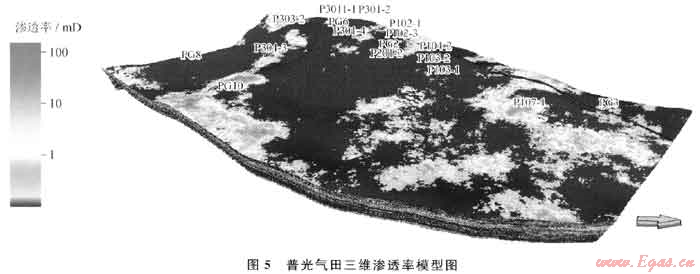 普光氣田儲(chǔ)集空間類型多樣,以孔隙為主,局部發(fā)育裂縫??紫抖群蜐B透率的關(guān)系受多種因素的控制,相關(guān)性不好。為此,在建立滲透率模型時(shí)分兩步進(jìn)行:①由于儲(chǔ)層孔隙類型不同導(dǎo)致孔隙度與滲透率關(guān)系多樣化,在計(jì)算滲透率模型時(shí),首先通過單井測(cè)井曲線聲波與密度的相對(duì)幅度差判斷孔隙結(jié)構(gòu)類型,按照不同孔隙結(jié)構(gòu)類型的孔滲關(guān)系式,由各井測(cè)井孔隙度計(jì)算出單井各層面不同孔隙類型的滲透率;②由于裂縫的存在,孔隙度變化不大,而滲透率卻成倍增大,因而在對(duì)滲透率模型計(jì)算時(shí)引入裂縫指數(shù)數(shù)據(jù)體對(duì)滲透率進(jìn)行裂縫校正。