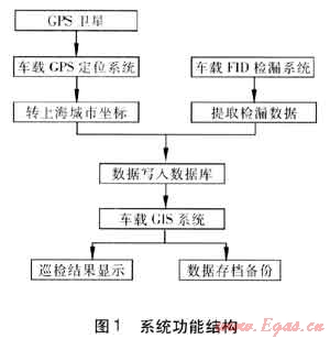 利用公司現(xiàn)有的數(shù)據(jù)和軟件平臺,將車載FID、車載GPS、GIS信息系統(tǒng)三者相結(jié)合,構(gòu)建起市北公司燃?xì)夤芫W(wǎng)泄漏的早期預(yù)警系統(tǒng)。其工作原理為FID檢漏儀檢測到管網(wǎng)泄漏點后,系統(tǒng)將完成兩項任務(wù),一方面自動讀取車載檢漏儀所采集到的數(shù)據(jù),將其寫入數(shù)據(jù)庫;另一方面,安裝在檢漏車上的GPS定位儀自動記錄泄漏點的空間坐標(biāo),并轉(zhuǎn)換為上海城市坐標(biāo),供安裝于車載筆記本電腦上的GIS系統(tǒng)使用。GIS系統(tǒng)將GPS傳送的空間坐標(biāo)以及FID采集到的泄漏數(shù)據(jù)整合,進行專業(yè)分析、專題顯示,形成相關(guān)的報告報表。圖1表示了整個系統(tǒng)的功能結(jié)構(gòu)。