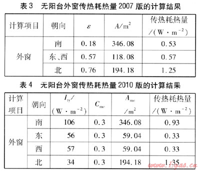無陽臺外窗傳熱耗熱量,采用2007版的計算方法時,由式(2)得到的計算結(jié)果見表3。采用2010版的計算方法時,由式(5)、(6)得到的計算結(jié)果見表4。由表3、4可知,由2010版計算得到的計算結(jié)果大于2007版,說明2007版中無陽臺外窗傳熱耗熱量計算中采用一個綜合修正系數(shù)強化了太陽輻射得熱對外窗傳熱耗熱量的影響。