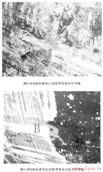 可以看到,管體3PE的劃透?jìng)诘脚亮_特補(bǔ)口處即告中斷,見(jiàn)圖3。也可看到,管體3PE的劃透?jìng)趶呐亮_特補(bǔ)口處之后開(kāi)始,見(jiàn)圖4。