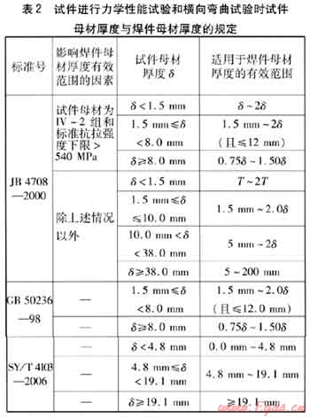 試件進(jìn)行力學(xué)性能試驗(yàn)和橫向彎曲試驗(yàn)時(shí)試件厚度與焊件母材厚度的規(guī)定見表2。