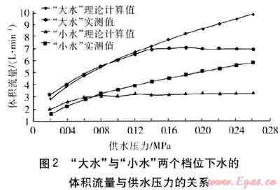 ② 在相同供水壓力下,“大水”檔位的體積流量較大,主要是因?yàn)?ldquo;大水”檔位的局部阻力比“小水”檔位的局部阻力小,即水量調(diào)節(jié)閥是通過(guò)調(diào)節(jié)局部阻力來(lái)調(diào)節(jié)流量的。