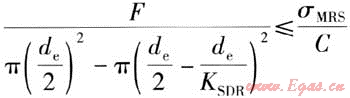 按GB 15558.1—2003《燃氣用埋地聚乙烯(PE)管道系統(tǒng)第1部分:管材》3.2.4條關(guān)于設計應力的定義:設計應力σs指規(guī)定條件下的允許應力,計算公式為: