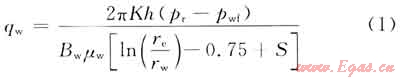 在排采初期,煤層中的水在儲(chǔ)層壓力(pr)與井底壓力(pwf)之差作用下進(jìn)入井中,此時(shí),整個(gè)煤儲(chǔ)層中單相流,考慮煤層氣井的泄流體積范罔內(nèi)為徑向流動(dòng),且水相滲流滿(mǎn)足達(dá)西定律,同時(shí)考慮表皮因子的影響,則第一個(gè)階段單相水的產(chǎn)量公式為: