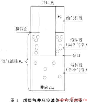 對(duì)于含氣量相對(duì)較高且具有一定穩(wěn)產(chǎn)能力的煤層氣井,可以將環(huán)空內(nèi)的流體劃分為純氣柱段、混氣液柱段(泡沫段和普通液氣段),如圖1所示。由于泡沫段的存在,使得擬液面的位置反映為泡沫段的上端面,環(huán)空液面往往并不能真實(shí)地反映煤層氣井的井底流壓,真實(shí)液面位置必須通過(guò)測(cè)試的擬液面與泡沫段長(zhǎng)度進(jìn)行修正。
