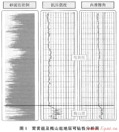 Φ311.15mm井段面臨著井段長、作業(yè)時間長、地層跨度大、下部層位石灰質含量高、二次造斜等諸多挑戰(zhàn),鉆頭選型是否合理,關系到整口井的時效高低。本井段穿越鶯黃組下部、梅山組、三亞組(部分井缺失)地層,鶯黃組下部地層較為均質,地層抗壓強度介于34.5~55.2MPa,內摩擦角在35°以下,具有較好的可鉆性;梅山組地層埋深大,地層抗壓強度介于55.2~103.4MPa,部分層位石灰質含量高,內摩擦角介于36°~40°,對鉆頭的抗沖擊性及抗研磨性具有較高的要求(圖1)。