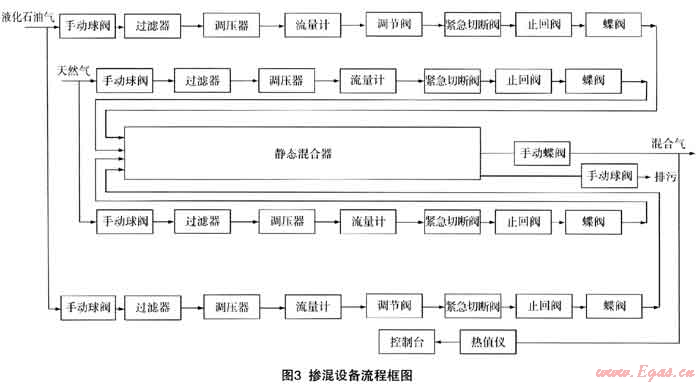 混合天然氣和LPG分別經(jīng)計(jì)量調(diào)壓后同時(shí)進(jìn)入混合器,混合器中設(shè)置了折流板和旋轉(zhuǎn)板,兩種氣體在混合器中經(jīng)過(guò)多次折返、旋轉(zhuǎn)流動(dòng),最后達(dá)到95%以上的混合效率。調(diào)節(jié)系統(tǒng)主要由一臺(tái)設(shè)在LPG回路的氣動(dòng)薄膜調(diào)節(jié)閥和相關(guān)控制部件組成,由控制系統(tǒng)根據(jù)天然氣的流量或混合氣的熱值自動(dòng)控制調(diào)節(jié)閥的開(kāi)度,從而實(shí)現(xiàn)對(duì)LPG進(jìn)入混合器流量的調(diào)控,達(dá)到設(shè)定的華白指數(shù)。