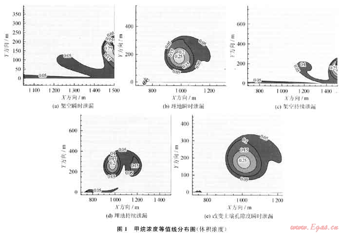 圖1為泄漏80s后甲烷濃度等值線分布。由圖可知:架空瞬時(shí)泄漏甲烷分布高濃度區(qū)擴(kuò)散至(1450m,200m)高空,分布不規(guī)則;埋地瞬時(shí)泄漏則分布在(1000m,150m)高空,呈圓形區(qū)域,在泄漏口有小范圍高濃度區(qū)。架空持續(xù)泄漏與架空瞬時(shí)泄漏分布曲線相似,但持續(xù)泄漏高濃度區(qū)向右下偏移。埋地持續(xù)濃度分布呈對(duì)稱結(jié)構(gòu),高濃度區(qū)內(nèi)存在左、右2個(gè)高濃度區(qū),近地面存在長(zhǎng)250m、高20m的扁長(zhǎng)狀爆炸區(qū)。增大土壤孔隙度后近地面無(wú)爆炸危險(xiǎn),濃度分布與埋地瞬時(shí)相似,但濃度降低。