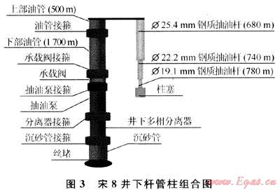 該井井下配套裝置采用前述Ф44mm防腐防氣整筒式金屬柱塞泵、組合式井下高效多相分離器、承載閥裝置。井下桿管柱結(jié)構(gòu)經(jīng)過優(yōu)化設計,在現(xiàn)有抽油機條件下,采用Ф25.4mm×820m+Ф22.2mm×800m+Ф19.1mm×700m的D級抽油桿方案(圖3)。但由于機抽井少,桿柱調(diào)節(jié)困難,仍采用原井桿柱(即泵掛2200m),且由于配套抽油桿短節(jié)缺失,上部Ф25.4mm抽油桿與光桿之間采用臨時加工的普通平扣短節(jié)代替。