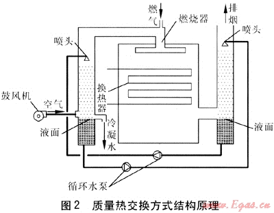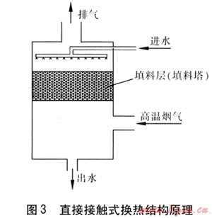 直接接觸式換熱是指將燃燒后的高溫?zé)煔庵苯优c水接觸進(jìn)行換熱。其結(jié)構(gòu)原理見圖3。
