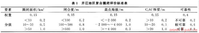 C2hl及其上、下巖層的組合是四川盆地多套生、儲蓋組合中較好的一套組合,經(jīng)過多年的勘探也證實C2hl具有豐富的天然氣資源。結(jié)合已發(fā)現(xiàn)C2hl氣藏特征對已識別C2hl復合圈閉面積進行劃分,圈閉面積小于10km2的權(quán)值取0.2,圈閉面積大于50km2的取權(quán)值1.0,圈閉面積介于10~50km2的取權(quán)值0.5,圈閉面積評價系數(shù)權(quán)重為O.15(表1)。
