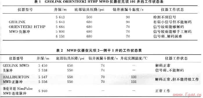 2) 川t東北工區(qū)的實踐表明:普通的HALLIBURTON MWD儀器的工作環(huán)境溫度不宜超過130℃;GEOLINK ORIENTEER2 HTHP儀器可適應更高的溫度和壓力,但必須要求有足夠的底部鉆具壓降,當其應用于井深超過6000m的井時,底部鉆具壓降應在800psi以上且鉆井液漏斗黏度不宜大于70s。