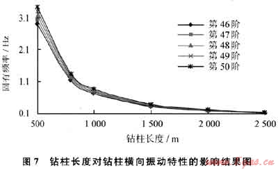取固有頻率階數(shù)為第46~50時的固有頻率值比較,鉆柱長度對振動的影響計算結(jié)果如圖7所示。鉆柱長度增加,其橫向振動固有頻率明顯降低。鉆柱長度的變化對直井整體鉆柱橫向振動特性影響非常明顯。根據(jù)計算結(jié)果,把固有頻率轉(zhuǎn)換成轉(zhuǎn)速,整體鉆柱長度為500m時,其對應(yīng)轉(zhuǎn)速在轉(zhuǎn)盤轉(zhuǎn)速60~70r/min的固有頻率有3階;鉆柱長度為800m時,有5階;鉆柱長度為1000m時,有7階;鉆柱長度為1500m時,有13階;鉆柱長度為2000m時,達16階;鉆柱長度為2500m時,共有20階之多。