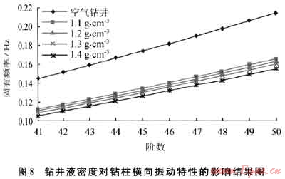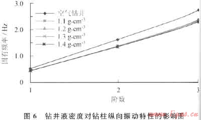 由于鉆井液的存在,鉆柱在進行軸向運動的時候,受到鉆井液的黏滯作用。根據(jù)鉆井液的流變特性,其密度越高,黏度越大,對鉆柱軸向運動的阻礙作用越明顯。可見,鉆井液會對鉆柱縱向振動的固有頻率產(chǎn)生很大影響,改變縱向振動的臨界轉(zhuǎn)速,這種影響必須引起足夠的重視。
